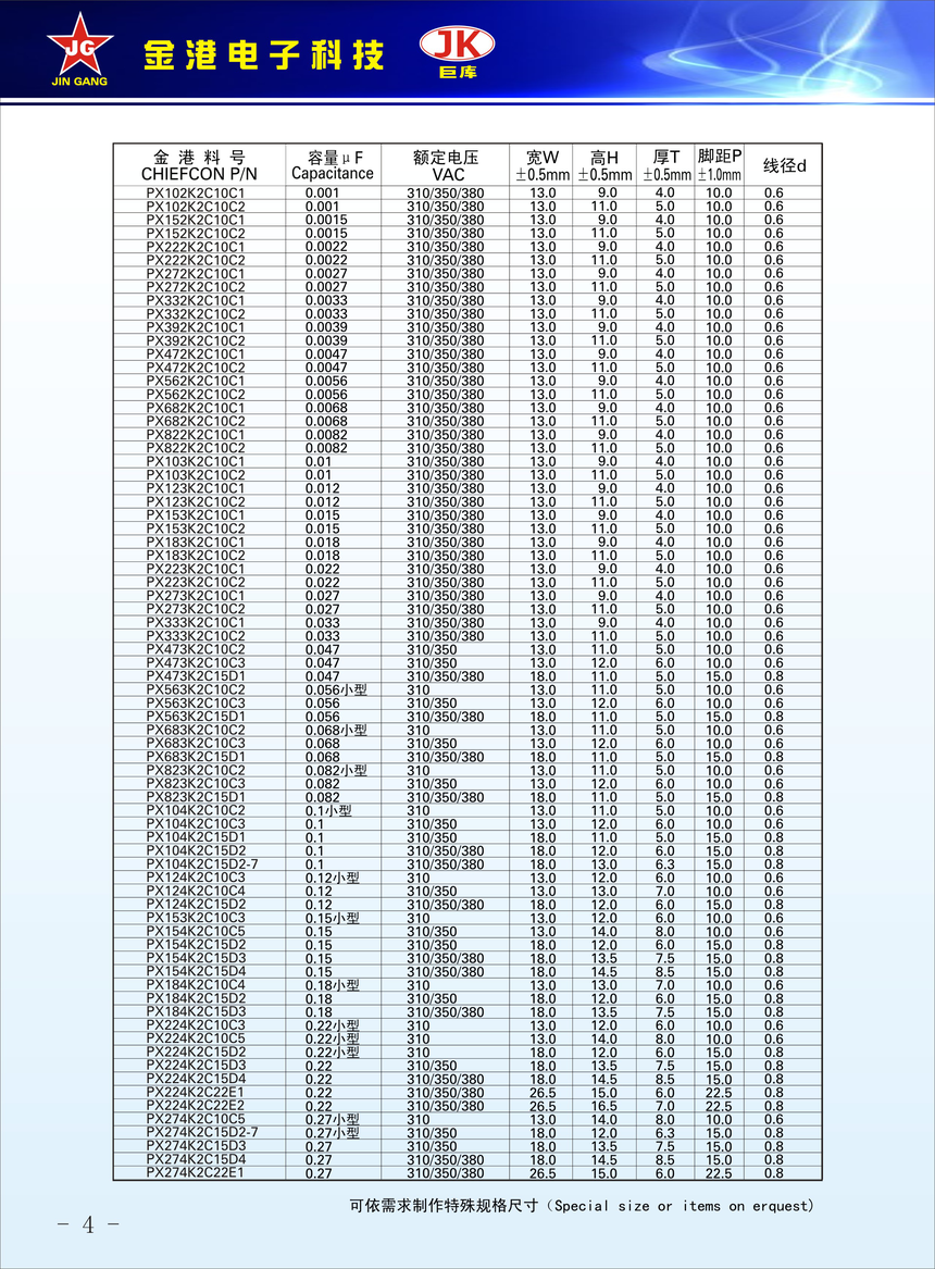 産(chǎn)品品牌(pái) :JK巨庫金(jīn)港JINGANG 産品(pin)材質: 金(jin)屬化聚(jù)丙烯高(gao)溫薄膜(mo) 産品性(xìng)能: 采用(yòng)高溫金(jīn)屬化聚(jù)丙烯薄(báo)膜 耐壓(yā)高,損耗(hào)低,内部(bù)溫升小(xiǎo),使用錫(xi)合金噴(pēn)金, 具備(bèi)良好的(de)通電流(liu)能力。 産(chǎn)品作用(yong): 廣泛應(yīng)用于各(ge)種交流(liú)跨接,抗(kang)幹擾電(dian)路場景(jing)。 定制加(jiā)工 :可按(an)客戶需(xu)求定制(zhì),滿足客(ke)戶不同(tóng)需求。