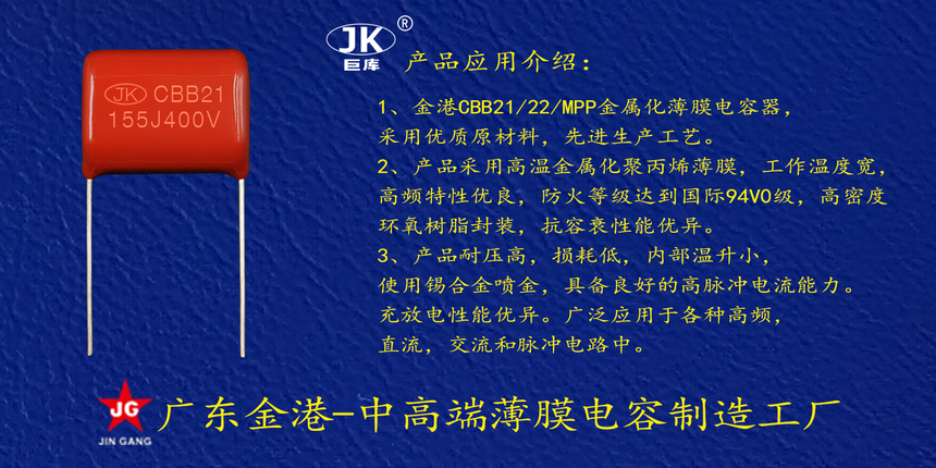 産(chǎn)品品牌(pai) :JK巨庫金(jīn)港JINGANG 産品(pǐn)材質: 金(jīn)屬化聚(ju)丙烯高(gāo)溫薄膜(mó) 産品性(xìng)能: 采用(yong)高溫金(jin)屬化聚(ju)丙烯薄(bao)膜 耐壓(ya)高,損耗(hao)低,内部(bu)溫升小(xiao),使用錫(xi)合金噴(pen)金, 具備(bèi)良好的(de)高脈沖(chòng)電流能(neng)力充放(fang)電性能(neng)優異。 産(chan)品作用(yòng): 廣泛應(yīng)用于各(ge)種高頻(pín),直流,交(jiao)流和脈(mo)沖電路(lù)中。 定制(zhi)加工 :可(kě)按客戶(hù)需求定(ding)制,滿足(zu)客戶不(bu)同需求(qiu)。