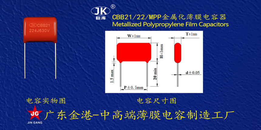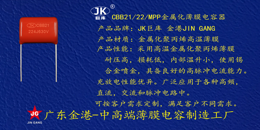 産品品(pǐn)牌 :JK巨庫金港(gǎng)JINGANG 産品材質: 金(jin)屬化聚丙烯(xī)高溫薄膜 産(chan)品性能: 采用(yòng)高溫金屬化(hua)聚丙烯薄膜(mó) 耐壓高,損耗(hào)低,内部溫升(shēng)小,使用錫合(he)金噴金, 具備(bèi)良好的高脈(mò)沖電流能力(li)充放電性能(néng)優異。 産品作(zuo)用: 廣泛應用(yòng)于各種高頻(pín),直流,交流和(he)脈沖電路中(zhōng)。 定制加工 :可(kě)按客戶需求(qiu)定制,滿足客(kè)戶不同需求(qiu)。