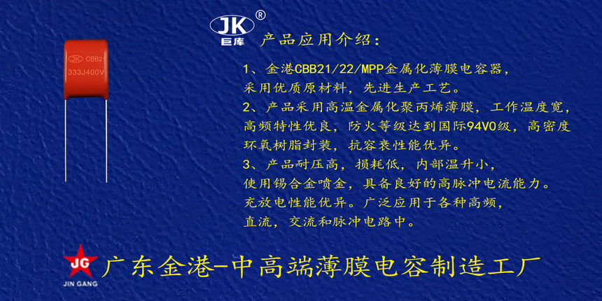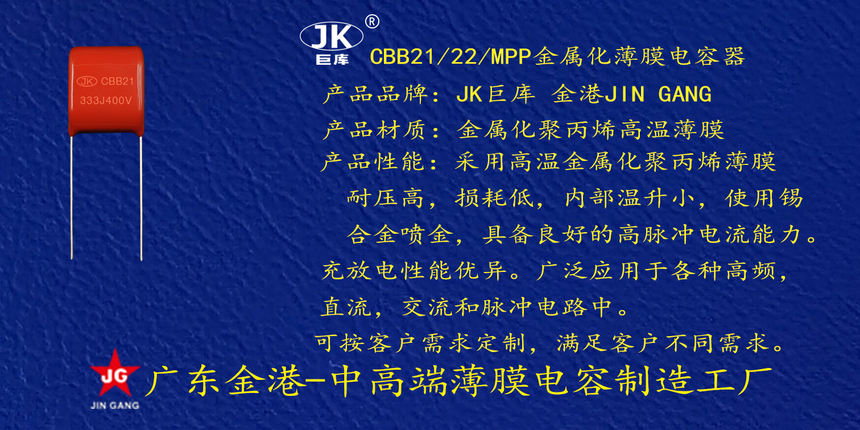 産品品牌(pai) :JK巨庫金港JINGANG 産品(pin)材質: 金屬化聚(jù)丙烯高溫薄膜(mo) 産品性能: 采用(yòng)高溫金屬化聚(jù)丙烯薄膜 耐壓(yā)高,損耗低,内部(bu)溫升小,使用錫(xī)合金噴金, 具備(bei)良好的高脈沖(chong)電流能力充放(fàng)電性能優異。 産(chǎn)品作用: 廣泛應(ying)用于各種高頻(pin),直流,交流和脈(mò)沖電路中。 定制(zhi)加工 :可按客戶(hu)需求定制,滿足(zú)客戶不同需求(qiú)。