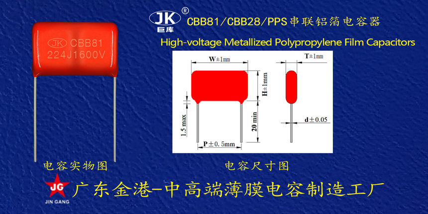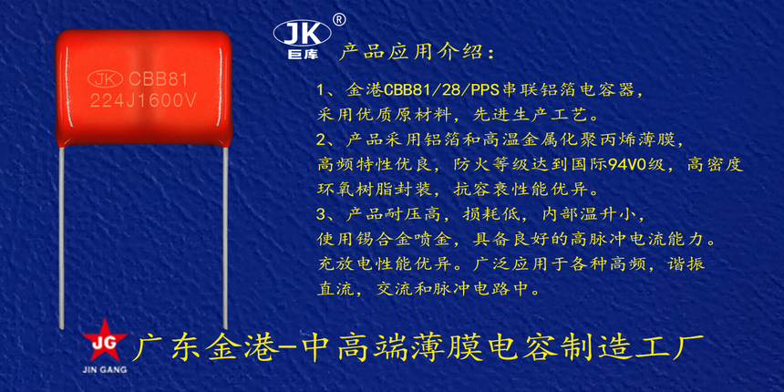 産品(pin)品牌 :JK巨(ju)庫金港(gang)JINGANG 産品材(cái)質: 金屬(shu)化聚丙(bǐng)烯高溫(wen)薄膜 産(chan)品性能(néng): 采用高(gāo)溫金屬(shu)化聚丙(bing)烯薄膜(mó) 耐壓高(gao),損耗低(di),内部溫(wen)升小,使(shi)用錫合(hé)金噴金(jīn), 具備良(liáng)好的高(gāo)脈沖電(dian)流能力(lì),充放電(diàn)性能優(you)異。 産品(pǐn)作用: 廣(guang)泛應用(yong)于各種(zhǒng)高頻諧(xie)振,直流(liu),交流和(hé)脈沖電(dian)路中。 定(dìng)制加工(gōng) :可按客(ke)戶需求(qiú)定制,滿(man)足客戶(hù)不同需(xū)求。