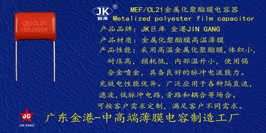 産品品(pǐn)牌 :JK巨庫金(jin)港JINGANG 産品材(cai)質: 金屬化(hua)聚丙烯高(gao)溫薄膜 産(chan)品性能: 采(cǎi)用高溫金(jīn)屬化聚丙(bǐng)烯薄膜 耐(nài)壓高,損耗(hào)低,内部溫(wēn)升小,使用(yòng)錫合金噴(pen)金, 具備良(liang)好的高脈(mò)沖電流能(néng)力,充放電(diàn)性能優異(yi)。 産品作用(yong): 廣泛應用(yong)于各種隔(gé)直流濾波(bō),低脈沖電(dian)路,旁路和(hé)耦合等場(chang)合。 定制加(jia)工 :可按客(kè)戶需求定(dìng)制,滿足客(kè)戶不同需(xu)求。