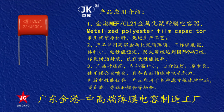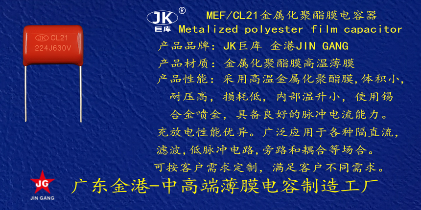 産品品牌(pai) :JK巨庫金港JINGANG 産(chǎn)品材質: 金屬(shǔ)化聚丙烯高(gāo)溫薄膜 産品(pǐn)性能: 采用高(gao)溫金屬化聚(jù)丙烯薄膜 耐(nài)壓高,損耗低(dī),内部溫升小(xiao),使用錫合金(jin)噴金, 具備良(liáng)好的高脈沖(chong)電流能力,充(chōng)放電性能優(you)異。 産品作用(yòng): 廣泛應用于(yu)各種隔直流(liu)濾波,低脈沖(chong)電路,旁路和(he)‼️耦合等場合(he)🙇♀️。 定制加工 :可(kě)按客戶需求(qiu)定制,滿足客(kè)戶不同需求(qiú)。