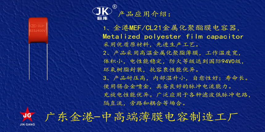 産品品牌(pái) :JK巨庫金港JINGANG 産品材(cái)質: 金屬化聚丙烯(xī)高溫薄膜 産品性(xìng)能: 采用高溫金屬(shǔ)化聚丙烯薄膜 耐(nài)壓高,損耗低,内部(bu)溫升小,使用錫合(he)金噴金, 具備良好(hǎo)的高脈沖電流能(neng)力,充放電性能優(you)異。 産品作用: 廣泛(fàn)應用于各種隔直(zhi)流濾波,低脈沖電(diàn)路,旁路和耦合♌等(děng)場合。 定制加工 :可(ke)按客戶需求定制(zhì),滿足客戶不同需(xū)求。