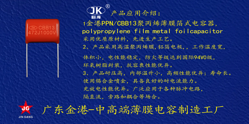 産品(pǐn)品牌 :JK巨(jù)庫金港(gǎng)JINGANG 産品材(cai)質: 鋁箔(bó)聚丙烯(xi)膜電容(rong)器 産品(pǐn)性能: 采(cǎi)用高溫(wen)聚丙烯(xi)膜,鋁箔(bó)電極耐(nài)壓高, 損(sun)耗低,i高(gāo)頻條件(jian)下内部(bu)溫升小(xiao)錫合金(jīn)噴金, 具(ju)備良好(hao)的耐電(dian)流能力(li)。充放電(diàn)性能優(yōu)異。 産品(pǐn)作用: 廣(guang)泛應用(yòng)于各種(zhong)直流,低(di)脈沖電(dian)路,等場(chang)合。 定制(zhi)加工 :可(kě)按客戶(hù)需求定(dìng)制,滿足(zu)客戶不(bú)同需求(qiu)。