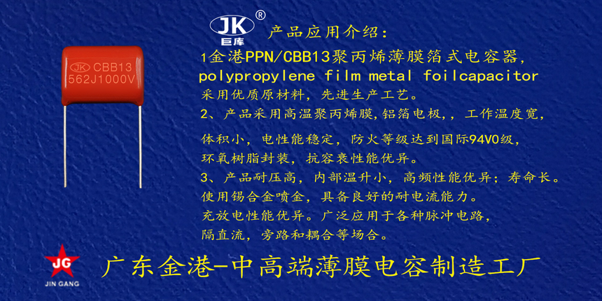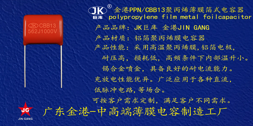 産品(pǐn)品牌 :JK巨(jù)庫金港(gǎng)JINGANG 産品材(cai)質: 鋁箔(bó)聚丙烯(xi)膜電容(rong)器 産品(pǐn)性能: 采(cǎi)用高溫(wen)聚丙烯(xi)膜,鋁箔(bó)電極耐(nài)壓高, 損(sun)耗低,i高(gāo)頻條件(jian)下内部(bu)溫升小(xiao)錫合金(jīn)噴金, 具(ju)備良好(hao)的耐電(dian)流能力(li)。充放電(diàn)性能優(yōu)異。 産品(pǐn)作用: 廣(guang)泛應用(yòng)于各種(zhong)直流,低(di)脈沖電(dian)路,等場(chang)合。 定制(zhi)加工 :可(kě)按客戶(hù)需求定(dìng)制,滿足(zu)客戶不(bú)同需求(qiu)。