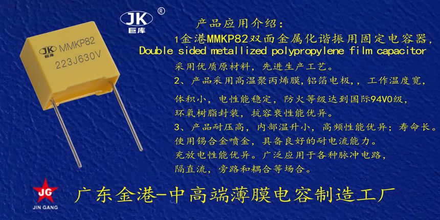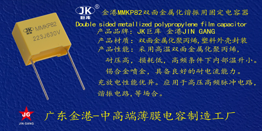 産品品牌 :JK巨庫(ku)金港JINGANG 産品材質: 雙(shuāng)面金屬化聚丙烯(xi),塑料外殼封裝 産(chan)品性能: 采用高溫(wēn)雙面化聚丙烯,耐(nài)壓高, 損耗低,高頻(pín)條件下内部溫升(shēng)小。錫合金噴金, 具(jù)備良好的耐電流(liú)能力。充放電性能(néng)優異。 産品作用: 應(yīng)用于高壓高頻脈(mò)沖電路,諧振電路(lu),等場合。
