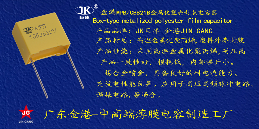 産品品牌(pái) :JK巨庫金港JINGANG 産品(pin)材質: 高溫金屬(shǔ)化聚丙烯,塑料(liao)外殼封裝 産品(pǐn)性能: 采用高溫(wēn)金屬化聚丙烯(xī),耐壓高産品一(yi)緻性好, 損耗低(dī),内部溫升小。錫(xī)合金噴金, 具備(bei)良好的耐電流(liu)能力。充放電性(xìng)能優異。 産品作(zuo)用: 應用于高壓(ya)高頻脈沖電路(lù),諧振電路,等場(chang)合。