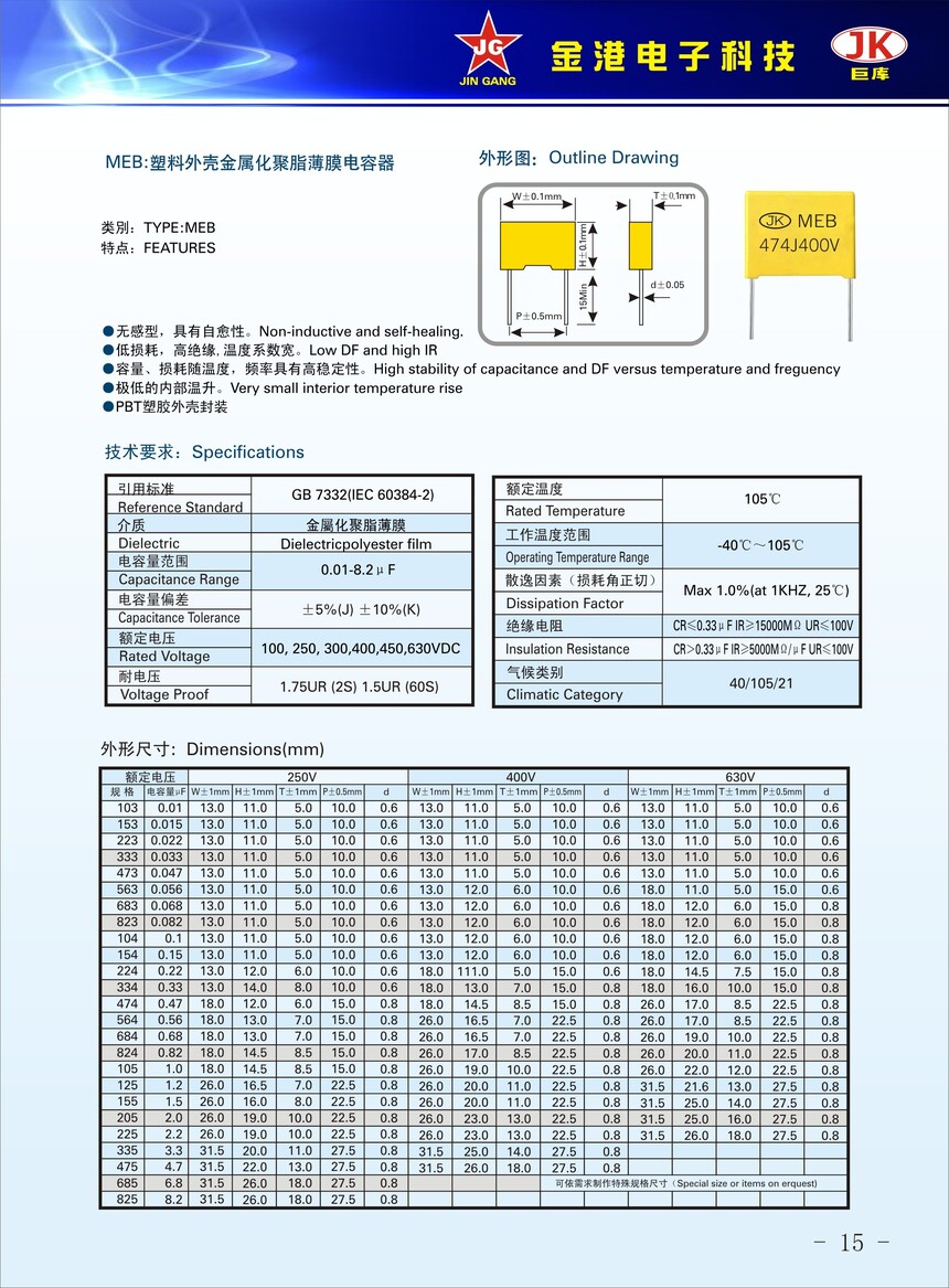 産(chan)品品牌(pái) :JK巨庫金(jīn)港JINGANG 産品(pin)材質: 高(gao)溫金屬(shu)化聚脂(zhī)薄膜,塑(sù)料外殼(ke)封裝 産(chǎn)品性能(néng): 采用高(gao)溫金屬(shǔ)化聚脂(zhi)薄膜,耐(nài)壓高