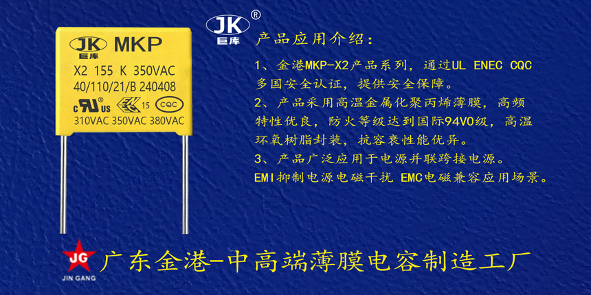 産品品牌(pai) :JK巨庫金港JINGANG 産品(pǐn)材質: 金屬化聚(jù)丙烯高溫薄膜(mo) 産品性能: 采用(yong)高溫金屬化聚(jù)丙烯薄膜 耐壓(ya)高,損耗低,内部(bu)溫升小,使用錫(xī)合金噴金, 具備(bei)良好的通電流(liú)能力。 産品作用(yòng): 廣泛應用于各(ge)種交流跨接,抗(kang)幹擾電路場景(jǐng)。 定制加工 :可按(an)客戶需求定制(zhì),滿足客戶不同(tóng)需求。